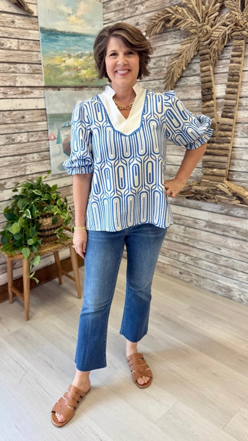 Meet the Melina Blue Trim Top—where timeless style meets playful charm. This eye-catching piece showcases a stunning blue hue beautifully framed by crisp white trim, delivering a look that's both refined and full of personality. The thoughtful color contrast creates visual interest while remaining versatile enough to pair with your favorite basics or statement pieces. Ideal for anyone seeking a top that feels as good as it looks, this is the kind of piece you'll reach for again and again.