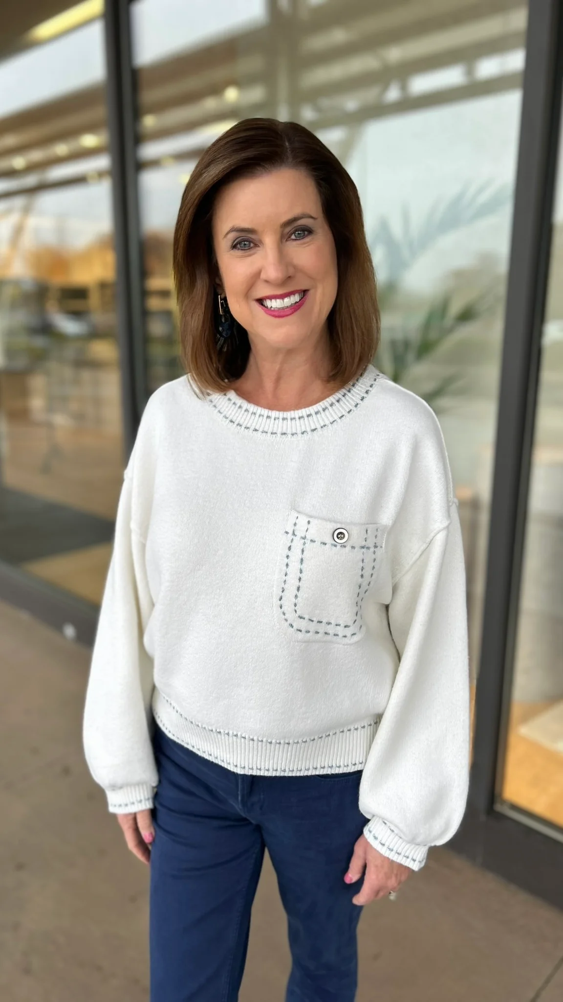 This adorable sweater features eye-catching blue stitch details and a charming pocket with a button. Its warm fabric ensures comfort, making it a stylish choice for any casual outing. Perfect for layering or wearing on its own, it adds a cute touch to your wardrobe.
