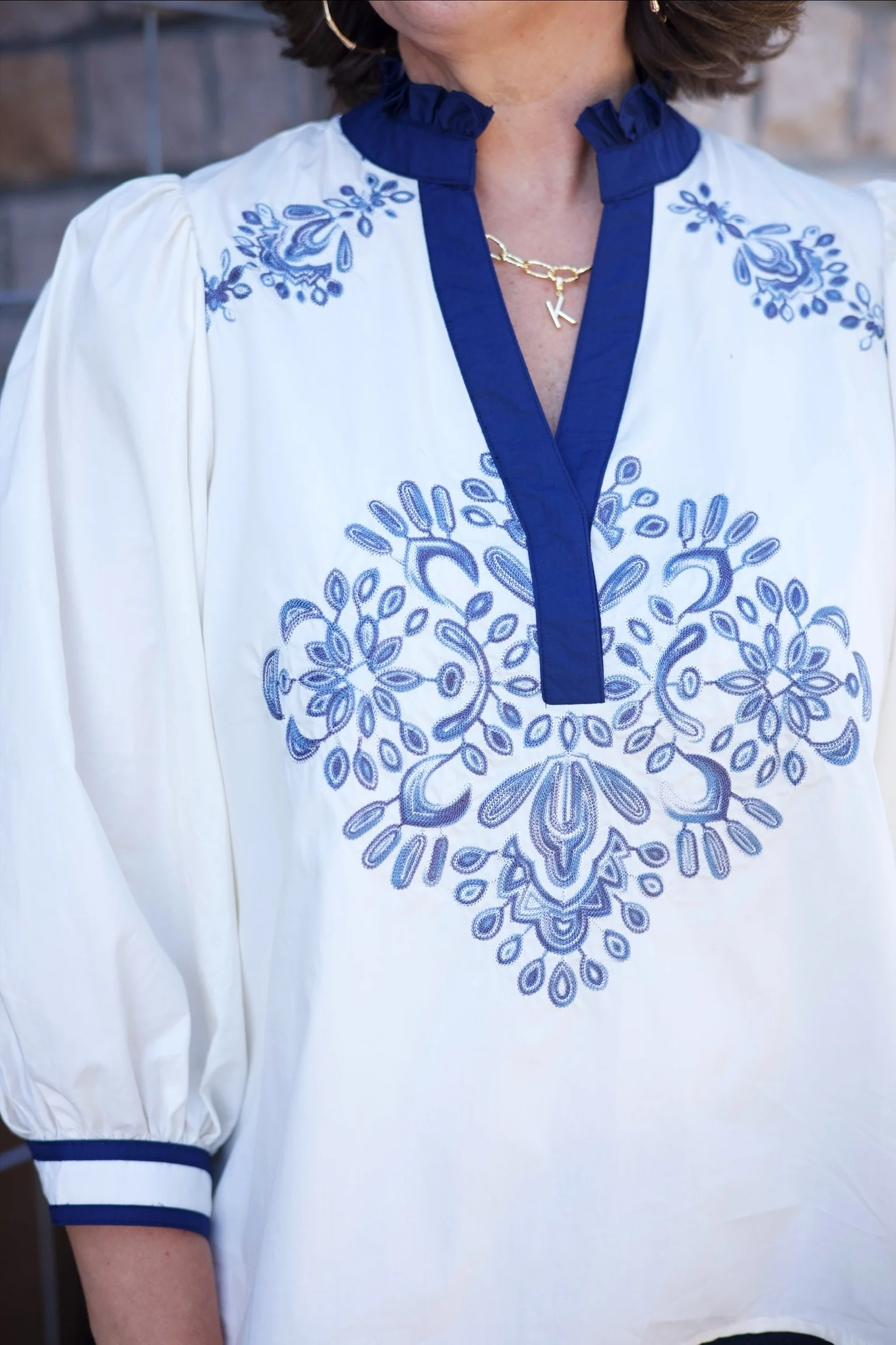 The Ingrid Embroidered Top in ivory combines delicate navy floral embroidery with long sleeves for a perfect fall look. Its versatile design makes it easy to dress up or down, blending cute and chic elements for a stylish finish. Ideal for any occasion, this top adds a polished touch to your wardrobe.