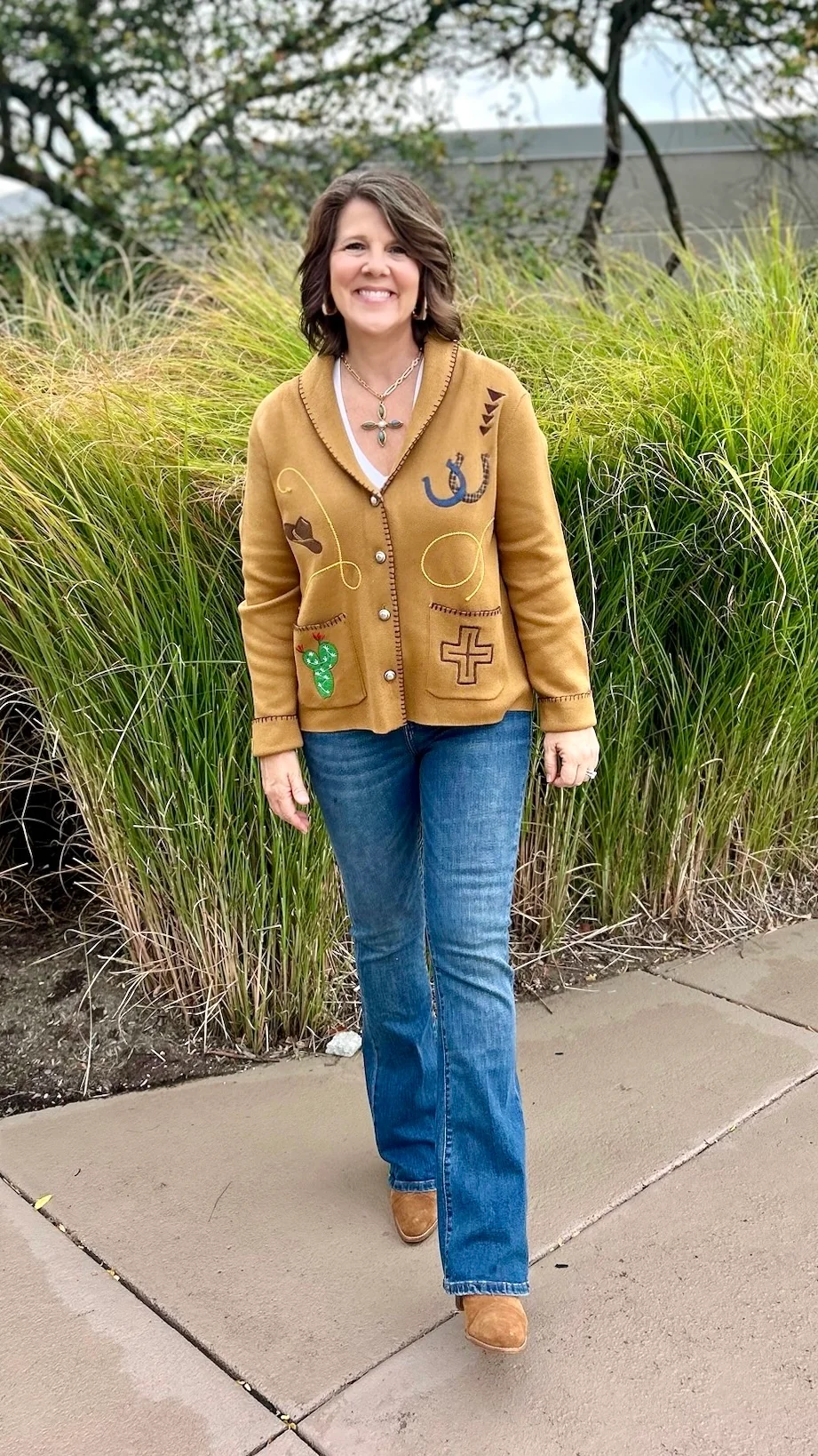 Stay cozy and charming this fall with the Caitlin Western Cardigan. Featuring a cute tan shade and a stylish shawl collar, this button-up top adds a touch of cowboy flair with its signature horseshoe detail. The practical pockets keep essentials close, while the soft cardigan fabric offers warmth and comfort. Perfect for layering on crisp autumn days, it’s a playful blend of western spirit and everyday wear.