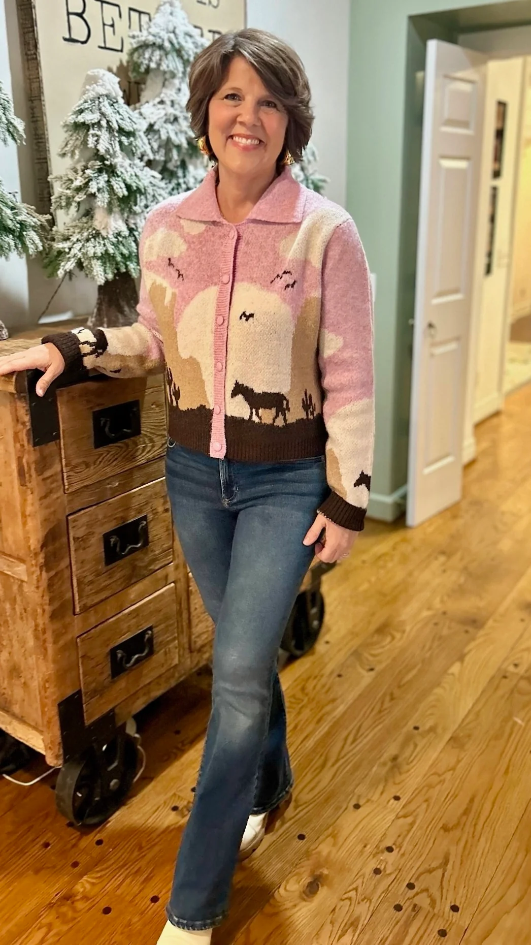 Discover the perfect blend of style and comfort with our Colorado Horse Cardigan in Pink. Featuring a beautiful design of mountains and horses, this soft knit cardigan is perfect for any season. Stay cozy and fashionable with this versatile piece that adds a touch of charm to any outfit.