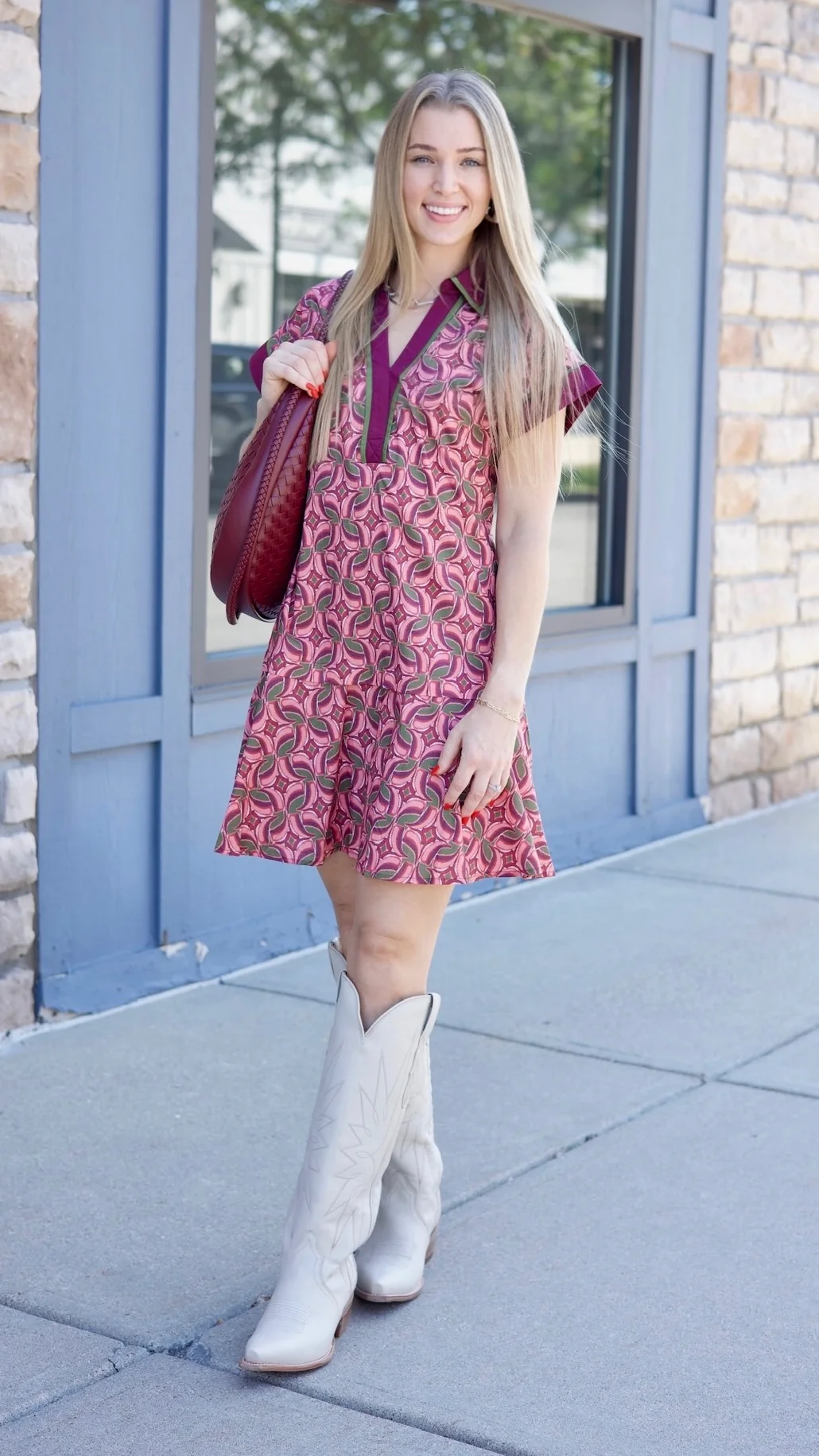 Experience elegance in our Whitney Wine Print Dress. With a stunning plum and olive green pattern, this dress is perfect for any occasion. The V-neck collar adds a touch of sophistication, making you feel confident and stylish. Elevate your wardrobe with this must-have piece.Â